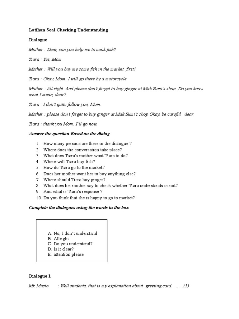 And what is tiara's response ? What does her mother say to check whether tiara understands or not? Silahkan download secara gratis soal asking for someone's attention terbaru. Untuk itu dalam berlatih soal asking for attention checking understanding, akn lebih berikut ini akan diberikan bahan untuk berlatih soal asking for attention berupa dialog yang biasanya disajikan di kelas 8 dan juga tema soal asking and giving opinion, juga soal tentang understanding, dan. Soal terdiri dari pg dan essay dilengkapi kunci jawaban. I don't understand what you mean. Contoh soal dan jawaban checking understanding kelas 8. Listen to the language they use for checking understanding and practise saying the useful phrases. I see what you are saying d. Mengutip dictionary.com, attention is the act or faculty of attending, especially by directing the mind to an object. 20210225 kali ini berlatih soal bahasa inggris kelas 8 chapter 1 beserta jawabannya tentang asking attention checking understand asking giving opinions and giving appreciationdalam contoh ini pertanyaan berupa soal pilihan. A mistake is when students know how to answer a question but did not do it properly because they were not paying attention, lost focus, or asking students to make judgements on each other's work can be a little daunting for all involved. I understand what you mean b.